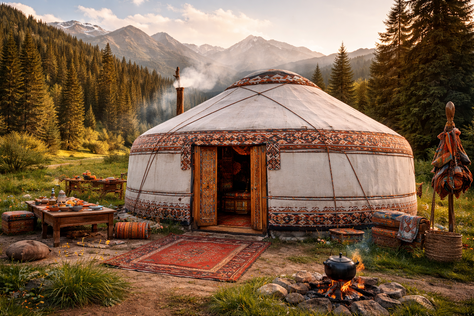- Казахстан - юрта создавалась как ответ на кочевой образ жизни, суровые климатические условия и необходимость быстрой адаптации к пространству степи.