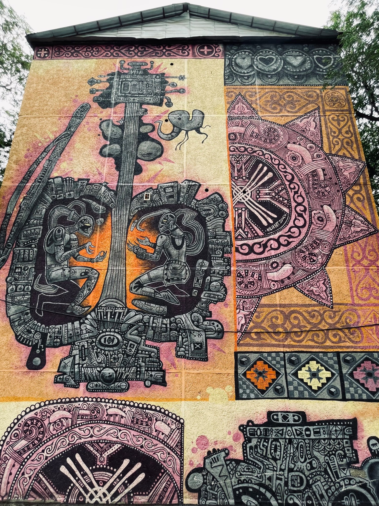 Мурал, созданный во время фестиваля Mural Fest. В центре композиции изображён традиционный инструмент кобыз, внутри которого танцуют мужчина и женщина — символ дуальности мира и гармонии.