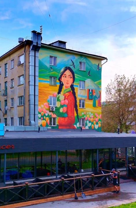 Мурал художницы Магиры Тлеубердиной, расположенный на торце здания по улице Габита Мусрепова. Работа посвящена теме мира и взаимопонимания.
