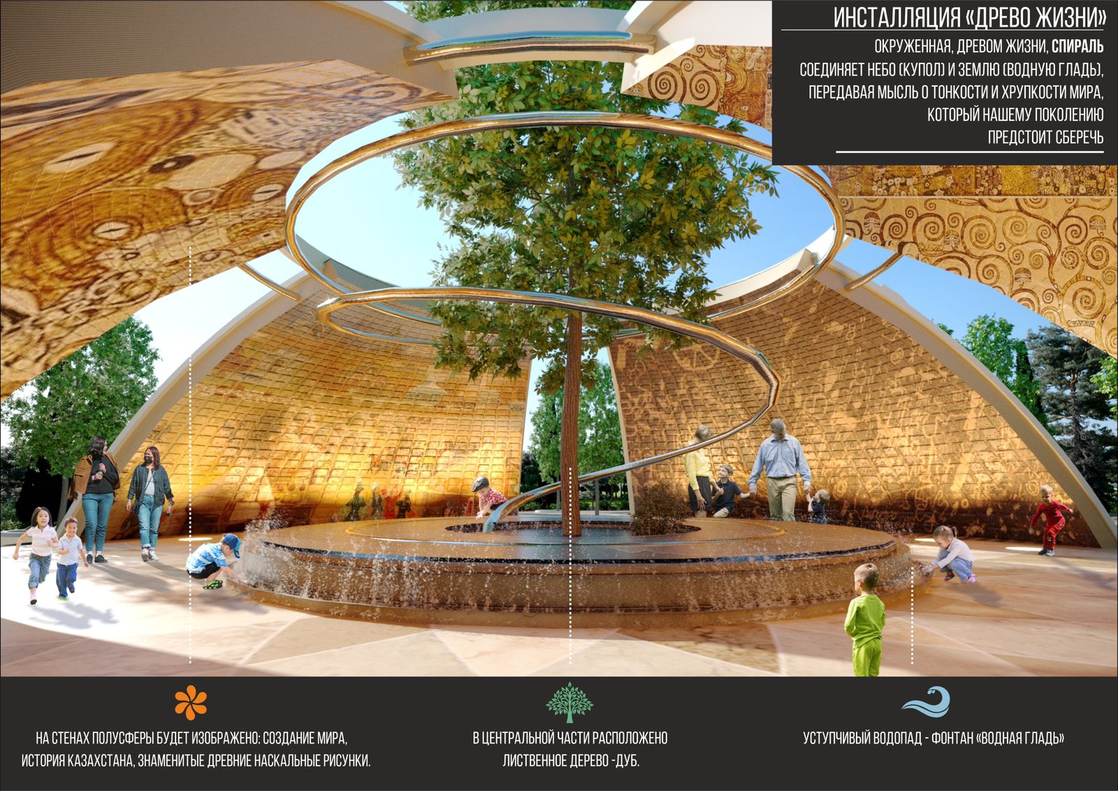 В центре композиции также предусмотрена водная гладь и фонтан, стекающий по камню. Вода здесь выступает как символ жизни, движения и обновления. Звук воды в сочетании с образом дерева создает атмосферу спокойствия и размышления, призывая к согласию, миру и взаимному уважению. Пространство организовано таким образом, чтобы человек ощущал себя частью чего-то большего. Вход в полукупол осуществляется через четыре стороны света - это символ открытости, равенства и объединения всех направлений и культур, своего рода метафора духовного храма, доступного каждому.