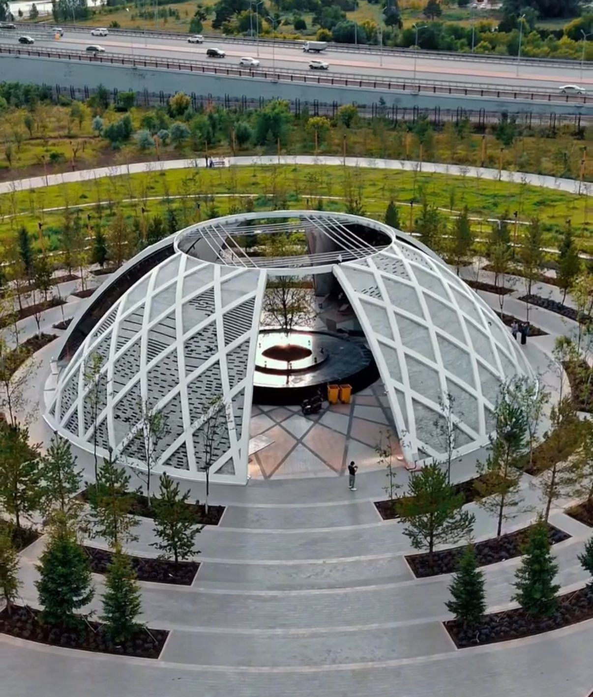 Особое значение имеет и ландшафтная часть: вокруг центрального холма было высажено 55 деревьев - по числу участников съезда мировых религий. Этот жест стал живым символом участия и единства. Позже, уже в рамках реализации проекта, территория была дополнительно благоустроена: появились новые посадки, водопадный фонтан, а также тематический тоннель, в котором художники отразили образы истории вдоль ветвей дерева.