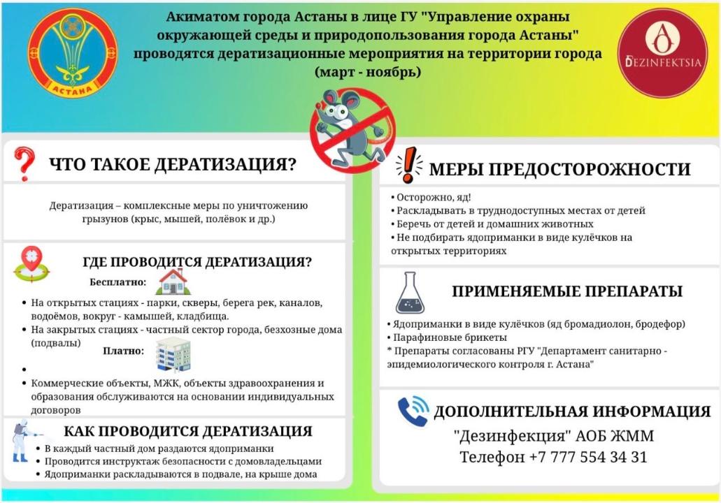 Как сообщает акимат города Астаны, в столице стартовала весенняя кампания по дератизации, в рамках которой обработают территории частного сектора и открытые общественные пространства. Обработке подлежат территории частного сектора, а также открытые пространства — парковые зоны, поймы рек, водоёмы, каналы и кладбища, сообщает официальный сайт городского акимата.